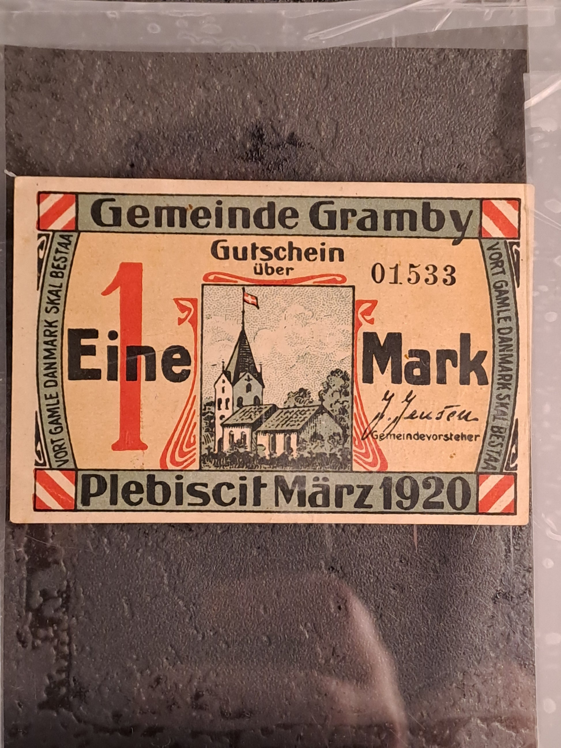Monteret imellem 2 plexiglas plader. Efter WW1 var der mangel på officiel valuta in Tyskland. Derfor fik kommunerne lov til at udstede deres egne pengesedler. I den tyske grænseregion blev de også brugt som propaganda i henhold til det forestående valg om tysk eller dansk tilhørsforhold.